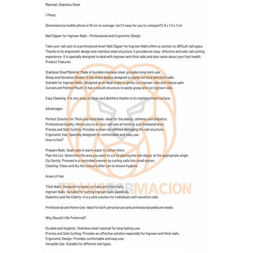 Tırnak bakımınızı profesyonel bir seviyeye taşıyın! Batık Tırnaklar İçin Tırnak Makası, zorlu tırnak tiplerine çözüm sunar. Ergonomik tasarımı ve paslanmaz çelik yapısı sayesinde kolay, etkili ve güvenli bir tırnak kesim deneyimi sağlar. Batık ve kalın tırnaklarla başa çıkmak için özel olarak tasarlanmıştır ve aynı zamanda ayak sağlığınıza önem verir. Ürün Özellikleri