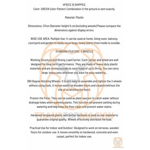 Çalışma Yapısı ve Güçlü Yük Taşıyıcı: Her bir taşıyıcısı ve tekeri, uzun süreli performans için iyi tasarlanmıştır. Ağır hizmet tipi plastik malzemelerden yapılmıştır ve 54 kg’a kadar yük taşıyacak kadar güçlüdürler. Kolay sulama için büyük, ağır saksıları istediğiniz yere taşıyabilirsiniz..
